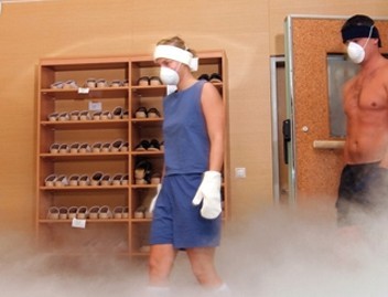走過第一層門,換鞋,戴口罩(像防毒面具),醫(yī)生囑托說,即使冷得發(fā)慌也不要去搓身上,皮膚在低溫下易受損傷。受不了的話,可以直接出去。