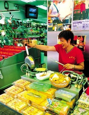 在通往大三巴的狹窄小街上,路兩邊是一間接一間的澳門特產(chǎn)牛肉干、豬肉干、杏仁餅等各種食品店,每一家都把產(chǎn)品擺到街邊,拉過路的游客品嘗。