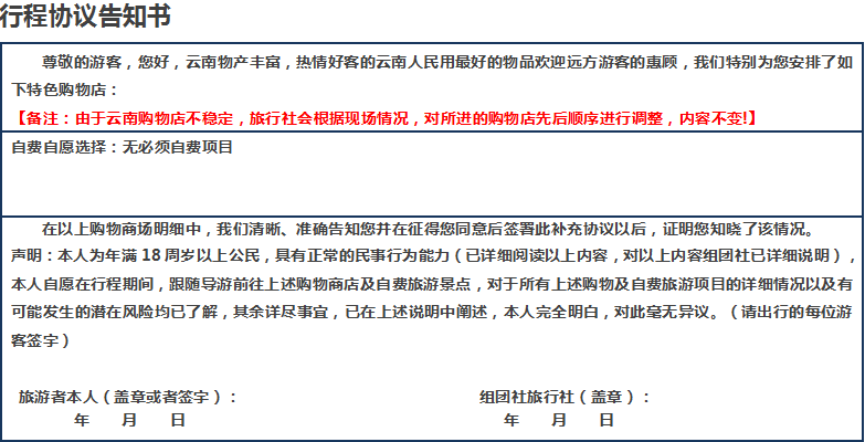 1、報價只含每人每天一床位,如產(chǎn)生單男單女須補(bǔ)房差。2、行程內(nèi)沒有約定包含的景區(qū)內(nèi)交通費(fèi)用;行程外的自費(fèi)節(jié)目及私人所產(chǎn)生的個人費(fèi)用等。3、不含旅游意外險,貴重物品隨身攜帶或者入住酒店在前臺寄存,以免丟失,請注意保管好自己的財物,如有財物丟失,旅行社不承擔(dān)責(zé)任。4、由于不可抗力或者旅行社、履行輔助人已盡合理義務(wù)仍無法避免的事件,而需要變更行程時產(chǎn)生的費(fèi)用(包括但不限于自然災(zāi)害、航班延誤或取消、車輛故障、交通意外等)。5、其他未約定由組團(tuán)社支付的費(fèi)用(包括節(jié)假日旺季升幅、機(jī)場內(nèi)候機(jī)和轉(zhuǎn)機(jī)的餐食、不可抗力因素所產(chǎn)生的額外費(fèi)用等)。6、客人若中途自愿離團(tuán),旅行社扣除實際產(chǎn)生費(fèi)用后,將未產(chǎn)生費(fèi)用余款退還,給旅行社造成損失的,旅游者應(yīng)當(dāng)依法承擔(dān)賠償責(zé)任。自愿簽字離團(tuán)后一切責(zé)任與旅行社無關(guān)。